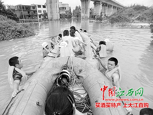 25日上午10時許,安源東大街因為強降雨內澇嚴重,局部水深達1.1米,街道40余人被困。由于過道狹窄,沖鋒舟無法通過,安源區公安消防官兵立即組成兩支小分隊,一隊官兵利用橡皮艇開展人員救助疏散,先后將40余名被困人員全部轉移到安全地帶。